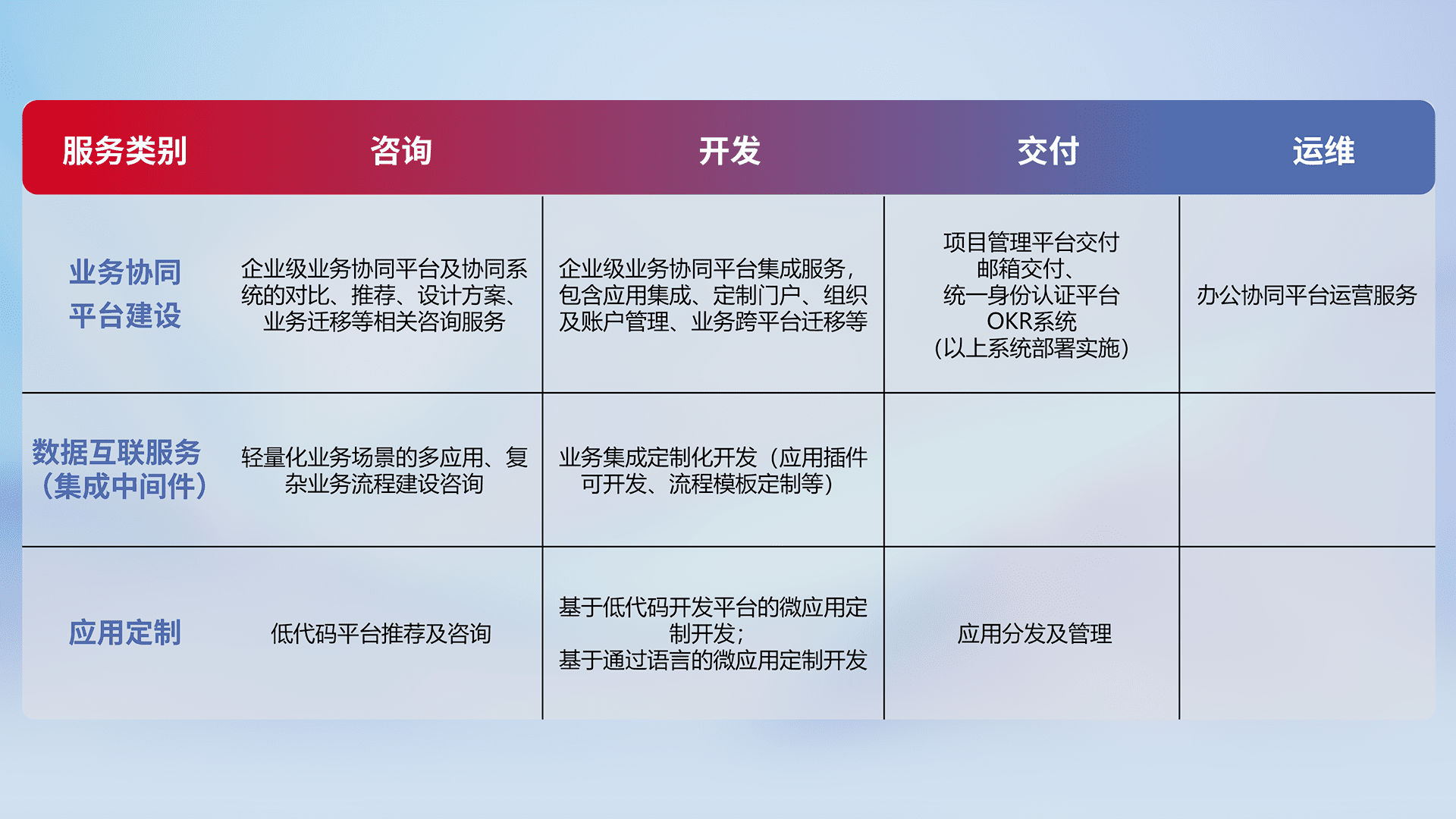 针对钉钉、、企微、、、、IDaas等平台级产品提供产品的规划、、、方案、、、、交付、、、、定制化开发等服务,,,实现如统一协同办公、、、智能客户服务、、、、混合会议管理、、智能数据查询、、、等业务场景,,,实现数字化转型。。。。